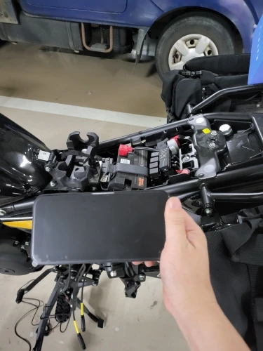 Le OnTrak est alimenté via une FuseBox intelligente (Offerte) qui coupe automatiquement le courant quand ta moto est éteinte.